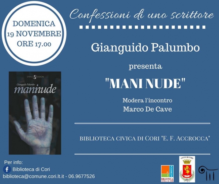 15/11/2017, 18:11 | Arte e CulturaDomenica 19 Novembre, alle ore 17:00, presso la Biblioteca civica "Elio Filippo Accrocca", è in programma un nuovo appuntamento con le "Confessioni di uno scrittore", la rassegna letteraria organizzata dall'Associazione culturale "Arcadia" e dall'Assessorato alla Cultura del Comune di Cori, che offre la possibilità di ascoltare dalla voce degli autori le storie e i percorsi che si nascondono dietro ogni loro opera. Ospite del prossimo incontro Gianguido Palumbo che parlerà del suo romanzo "Mani nude" (Spring Edizioni). Moderatore Marco De Cave.