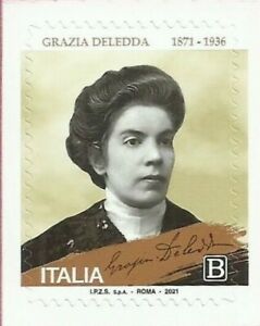 30/09/2021, 16:19Il 27 settembre 2021 viene emesso dal Ministero dello Sviluppo Economico un francobollo commemorativo di Grazia Deledda, nel 150° anniversario della nascita, al valore della tariffa B pari a 1,10€. Tiratura: trecentomila esemplari. Fogli da quarantacinque esemplari. Il francobollo è stampato dall’Istituto Poligrafico e Zecca dello Stato S.p.A., in rotocalcografia, su carta bianca, patinata neutra, autoadesiva non fluorescente.