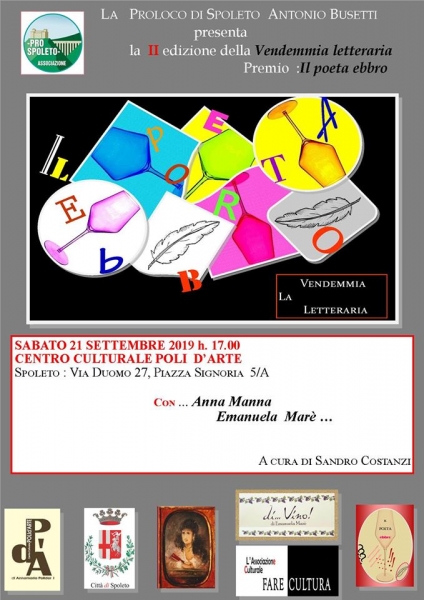 Il 21 settembre alle ore 17,00 a Spoleto la Proloco A. BUSETTI presenta la Vendemmia letteraria 2019 con la seconda edizione del Premio IL POETA EBBRO .
