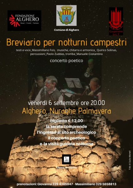 05/09/2019, 10:56Venerdì 6 settembre, alle 20, nel Complesso nuragico di Palmavera, ad Alghero, dopo undici date in giro per la Sardegna, andrà in scena il concerto poetico “Breviario per notturni campestri” (testo pubblicato dalle Edizioni Nemapress), con testi e voce di Massimiliano Fois, le musiche, chitarra ed armonica di Quirico Solinas, accompagnati alle percussioni da Paolo Zuddas ed alla tromba da Manuele Costantino. Nello spettacolo, che ha il patrocinio della Fondazione Alghero e del Comune di Alghero, il sacro ed il profano si fondono tra musica, parole e ricordi, in una Sardegna ancestrale e magica, che riecheggia tra preghiere e rituali tramandati a fior di labbra, vibrazioni radio temporali, la fine del mare, amori ermetici, attese in silenzio e canti dispersi nella notte.