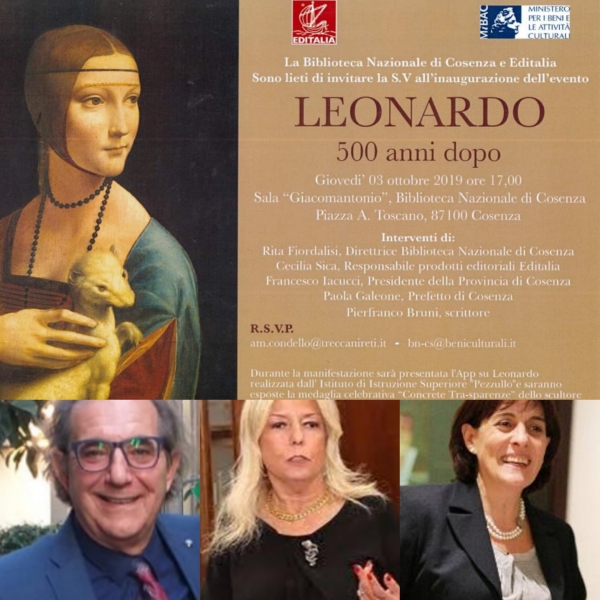 È la volta di Cosenza e della Biblioteca nazionale che con una mostra e un convegno siglerá un delle tappe fondamentali. Perché continuo a discutere e a relazionare su Leonardo a 500 anni dalla morte? Figure istituzionali come il prefetto, il questore e dirigenti del mibac interverranno. Cosa é stato Leonardo nella nostra cultura? La seduzione è il cerchio magico nel cuore che si sposta tra gli sguardi e diventa attrazione. Quando si prende consapevolezza che “L’età, che vola, discorre nascostamente, e inganna altrui; e niuna cosa è più veloce che gli anni, e chi semina virtù, fama raccoglie” (Leonardo da Vinci), tutto diventa infinitamente possibile.