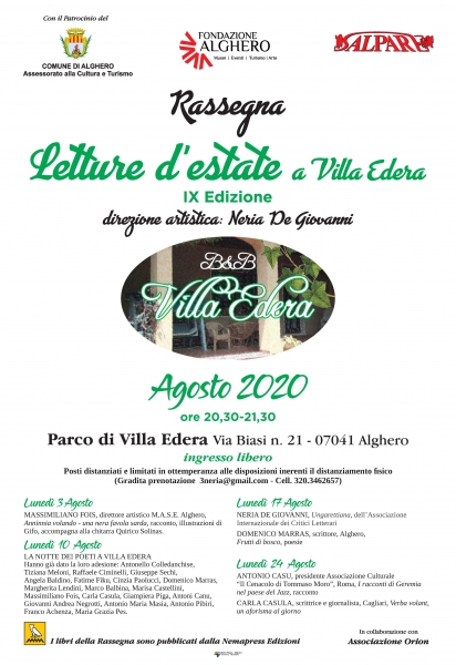 27/07/2020, 08:55Il mese di agosto si terrà ad Alghero presso il Parco Villa Edera il consueto appuntamento della Rassegna Letture d’Estate a Villa Edera, curata dall’Associazione Salpare con la direzione artistica di Neria De Giovanni, in collaborazione con l’Associazione Orion.