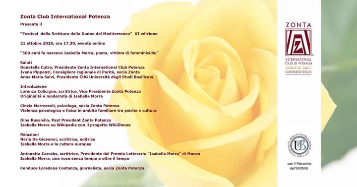 Il Zonta Club Internazionale di Potenza con il patrocinio dell’UNIBAS, organizza la sesta edizione del Festival della scrittura delle donne del Mediterraneo, il 21 ottobre alle ore 17,30.