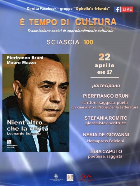 15/04/2021, 17:01Giovedì 22 aprile alle ore 17,00 nell'ambito della trasmissione televisiva "E' tempo di culltura", in diretta facebook sulla pagina del gruppo "Ophelia' s friends", verrà trasmesso l'incontro con Pierfranco Bruni, vicepresidente del Sindacato Libero Scrittori Italiani, critico e saggista, sul suo ultimo ultimo "Nient'altro che la verità- Leonardo Sciascia", pubblicato dalla Nemapress Edizioni in occasione del centenario della nascita dello scrittore siciliano.