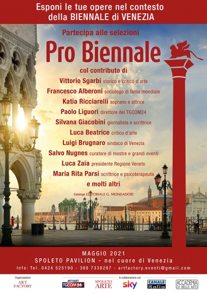 06/05/2021, 09:49Torna anche quest’anno la mostra internazionale Pro Biennale, che si terrà alla fine di maggio nella splendida cornice dello Spoleto Pavilion, storico palazzo nel cuore di Venezia, nel contesto della Biennale. L’esposizione, alla quale parteciperanno artisti provenienti da diversi Paesi nel mondo, è ormai da anni un appuntamento imperdibile per i tanti esperti ed appassionati d’arte contemporanea italiana ed internazionale.