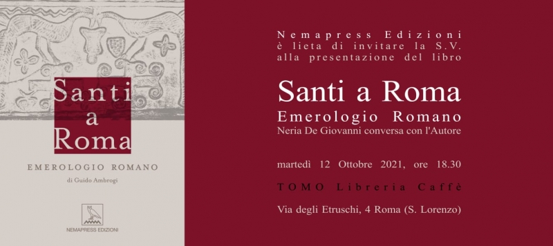 Martedì 12 ottobre alle ore 18,30, c/o Tomo Libreria Caffè, via degli Etruschi, nel quartiere di San Lorenzo, a Roma , Neria De Giovanni introduce e conversa con Guido Ambrogi per il suo libro “Santi a Roma” (ingresso libero fino a concorrenza dei posti e con esibizione di Green Pass).